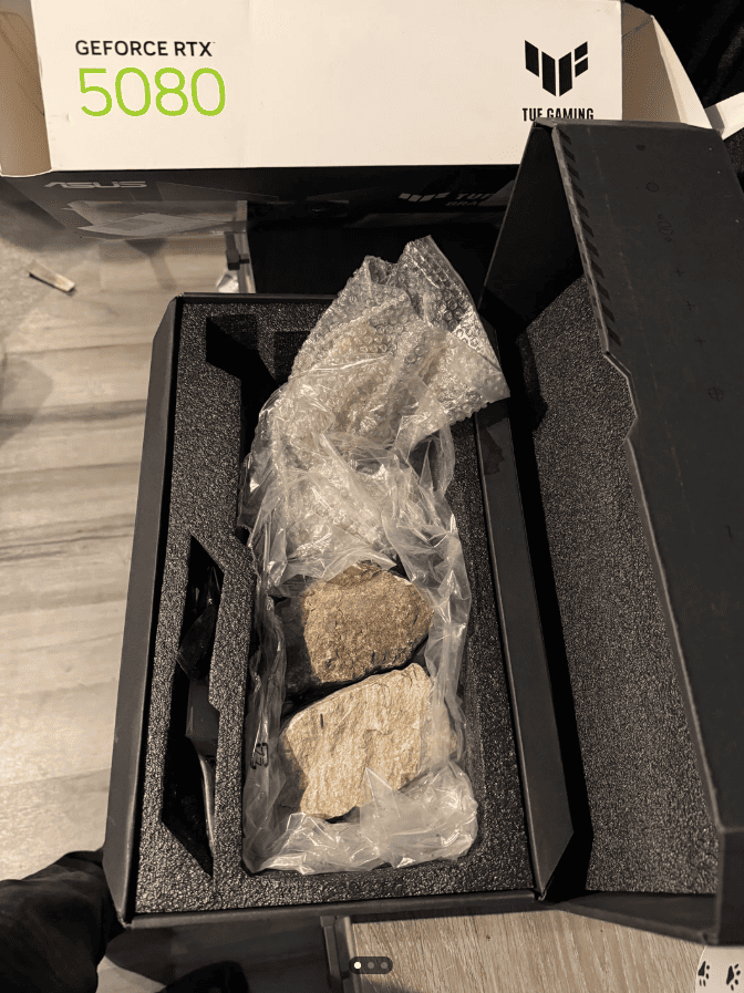 近期,國外論壇 Reddit 用戶 GnarDead 分享了一段令人心碎的經歷:他花費約 1,200 美元(約合台幣 38,000 元)在知名電商 Best Buy 訂購了一張華碩 TUF Gaming GeForce RTX 5080 顯示卡,滿心期待地開箱,結果映入眼簾的竟不是高科技顯卡,而是整整一盒石塊。更慘的是,Best Buy 在經過「調查」後拒絕賠償,讓玩家求助無門。