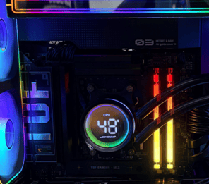 請仔細看這張特寫。除了中間水冷頭顯示著幾何圖形外,上方的一體式水冷風扇側邊,竟然還有三個長條形螢幕!