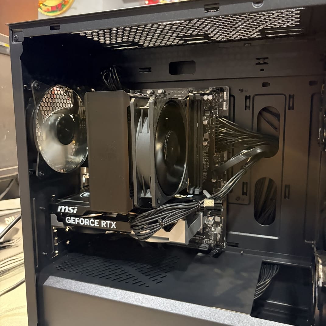 我們在安裝時特別注意了顯示卡與下方電源艙的間距,確保微星 RTX 5060 的雙風扇有足夠的呼吸空間。良好的空氣對流循環,代表著更好的散熱與更耐用的零件壽命。接下來你會看到移除側板後的內部清爽走線。