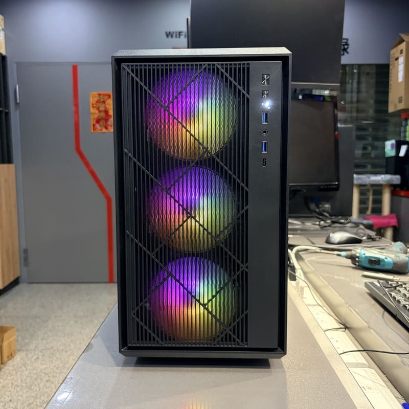 從照片裡可以看到,機殼正面採用了大面積的幾何線條網孔設計,內部透出隱約的 ARGB 風扇光效。這不僅讓外觀簡約有質感,更重要的是確保了大量的冷空氣能夠毫無阻礙地被吸入機殼內部,這是專業手路中確保「良好風道」的第一步。
