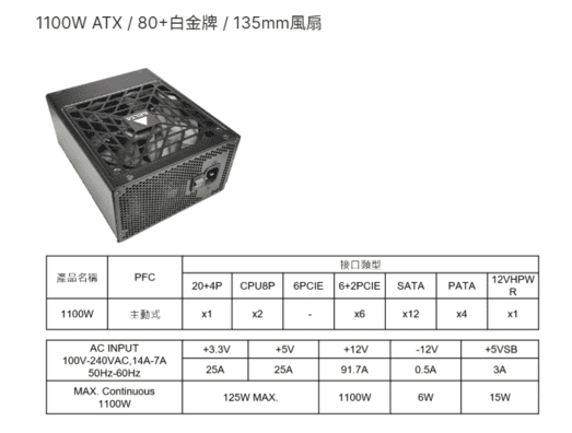- 特色: 通過 80+ 白金認證,全日系電容,具備 ECO 智慧溫控系統,負載低時風扇完全靜止。